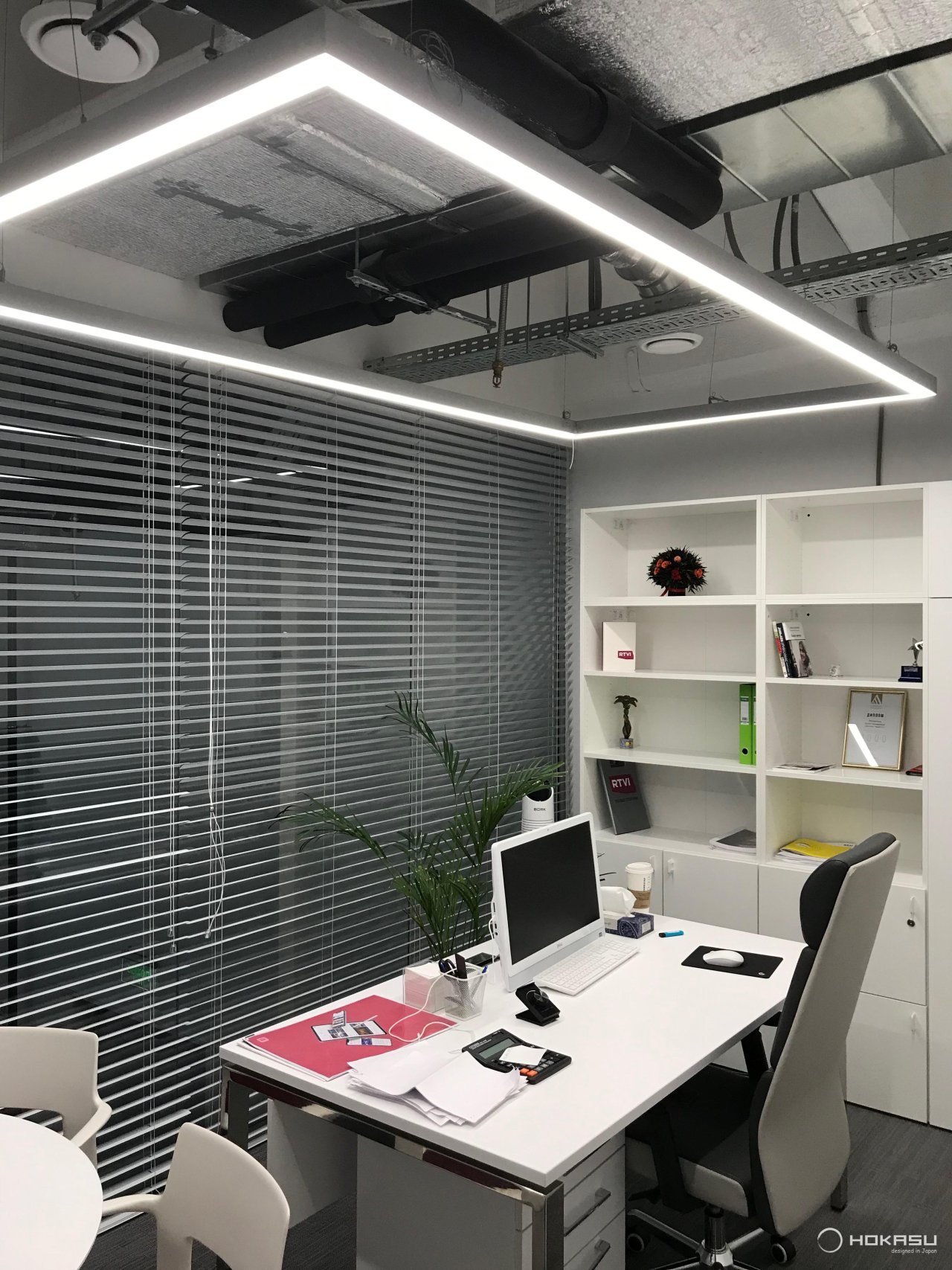 Above the desk is a rectangular structure with dimensions 1250x2500mm series HOKASU Frame – a functional pendant frame light. The profile is made in silver color. The construction is made of 50x50mm profile.