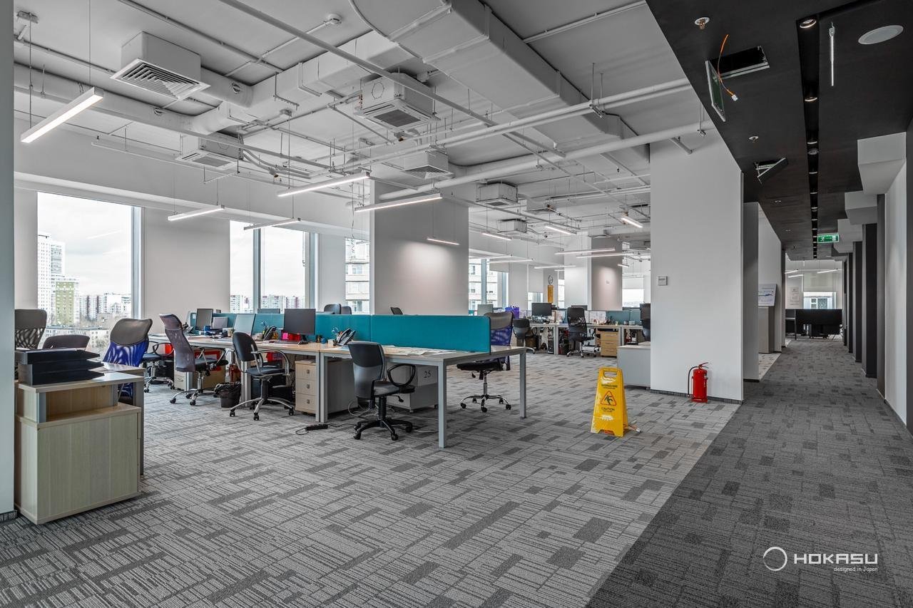 The design project focuses on work transparency: the space is built in an open style. The authors' idea was to create an open space to develop the company's philosophy based on the culture of the nuclear industry. Linear lighting by a series of HOKASU S50 luminaires was organized over the space. The luminaires are mounted on long suspensions - such a solution visually lowers the ceilings.